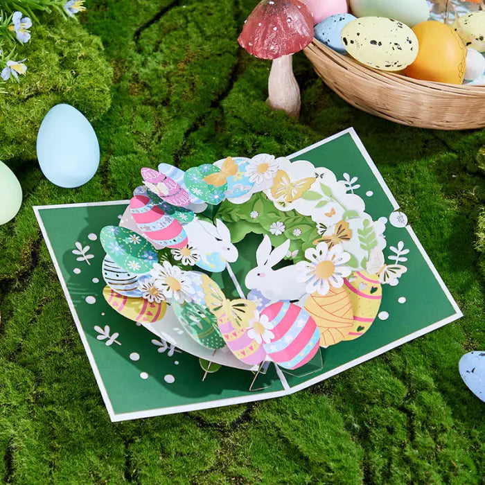 An Easter Bunny wreath pop-up card is a unique and creative way to celebrate Easter. This type of card features an intricate pop-up design in the shape of a wreath, with a cute and whimsical Easter bunny as the centerpiece. The wreath is typically made of brightly colored paper, with eggs, flowers, and other Easter-themed embellishments. When the card is opened, the wreath pops out in a three-dimensional display, creating a delightful surprise for the recipient. This type of card is a perfect way to add a touch of magic to an Easter greeting and is sure to bring a smile to the face of anyone who receives it.