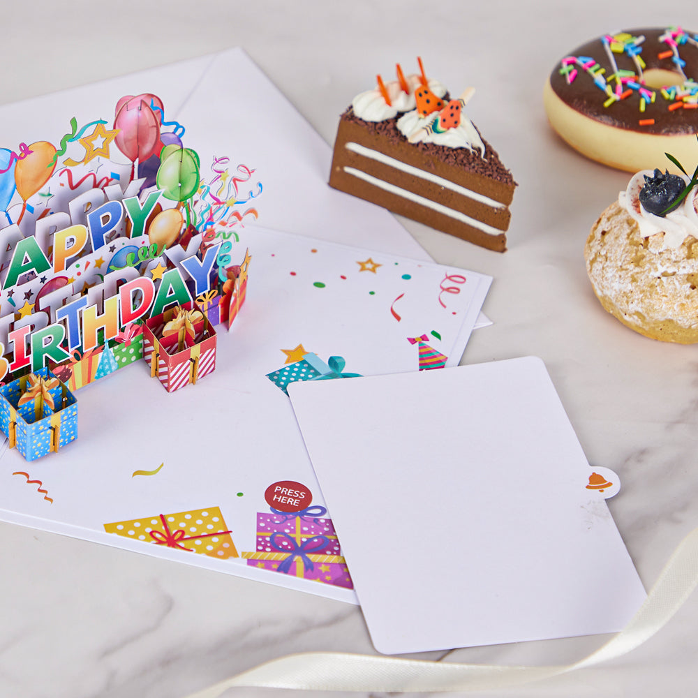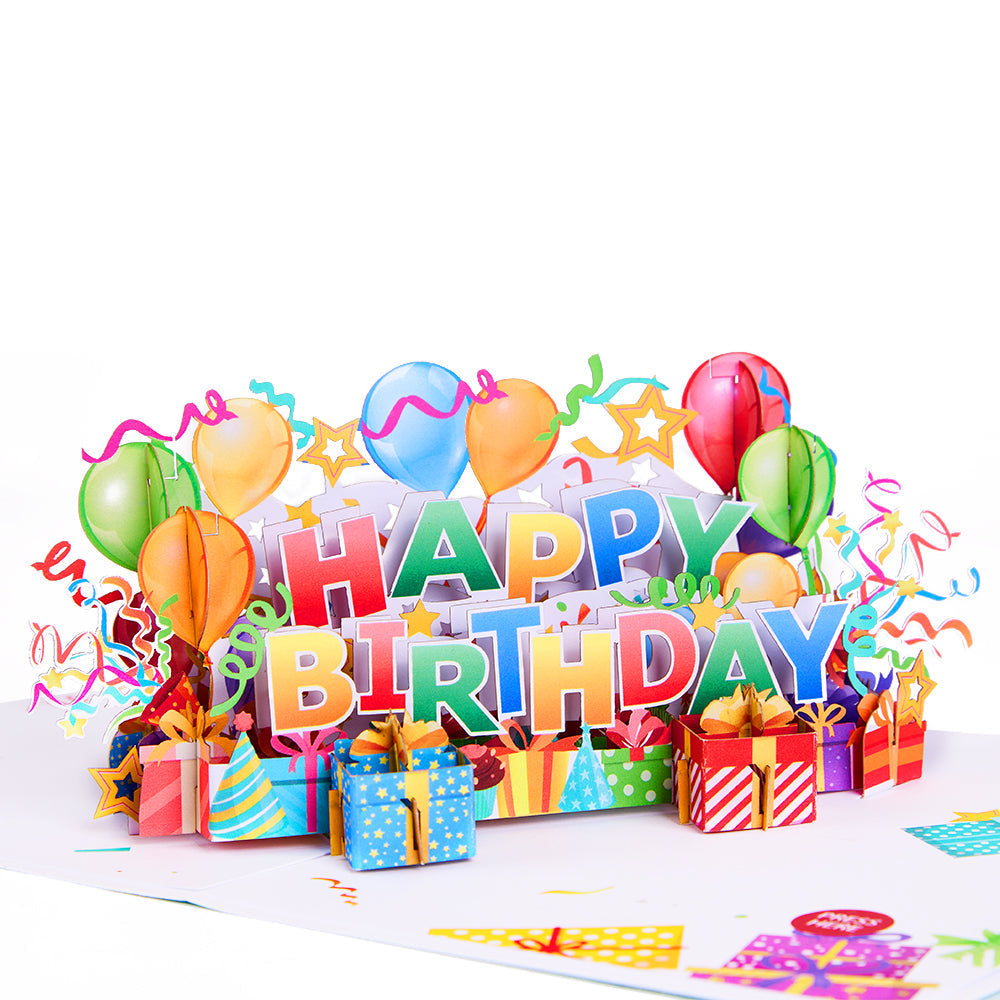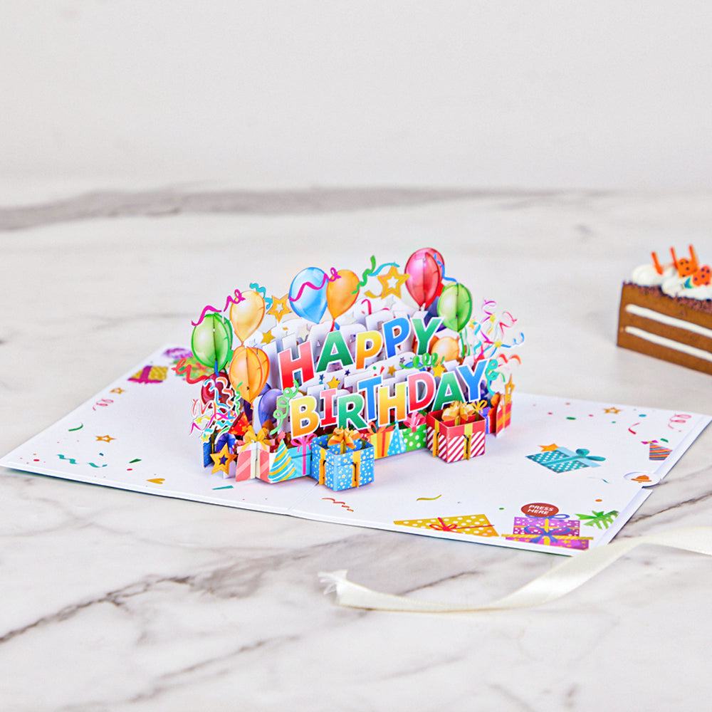 Our birthday greeting card features a three-dimensional of"HAPPY BIRTHDAY" words, laser-cut design with colorful balloons, streamers, and gifts for display.