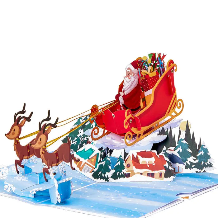 If you want to tell your child the story of Santa Claus,it would be a perfect gift for him. When unfolded, the scene pops up in front of the recipient,that Santa Claus riding his sleigh pulled by reindeers. Santa Claus is busy delivering gifts to various households before dawn.Send this happy holiday card to boys, girls, children, friends, family or your loved ones and give them merry Christmas wishes and New Year Blessings.