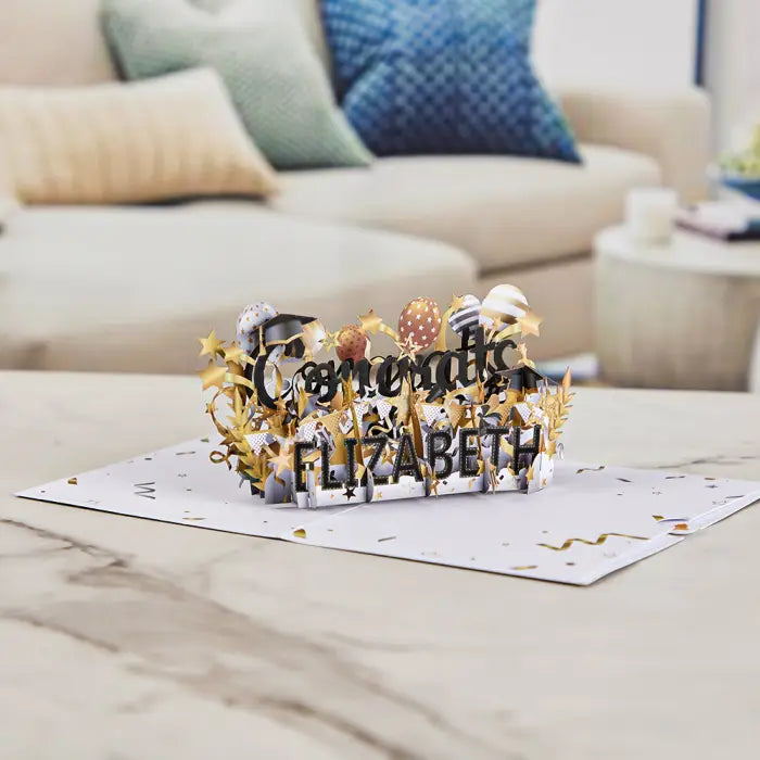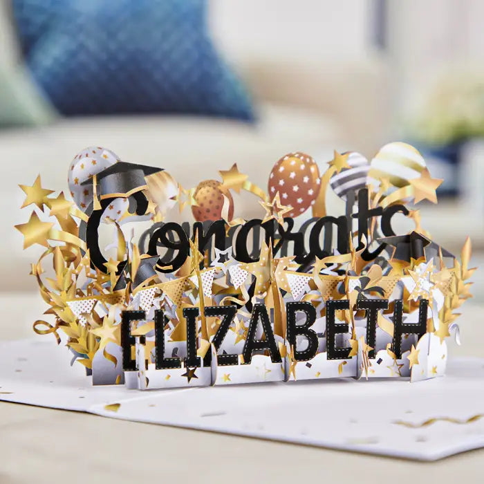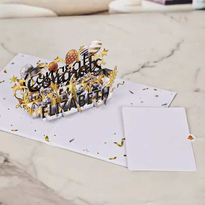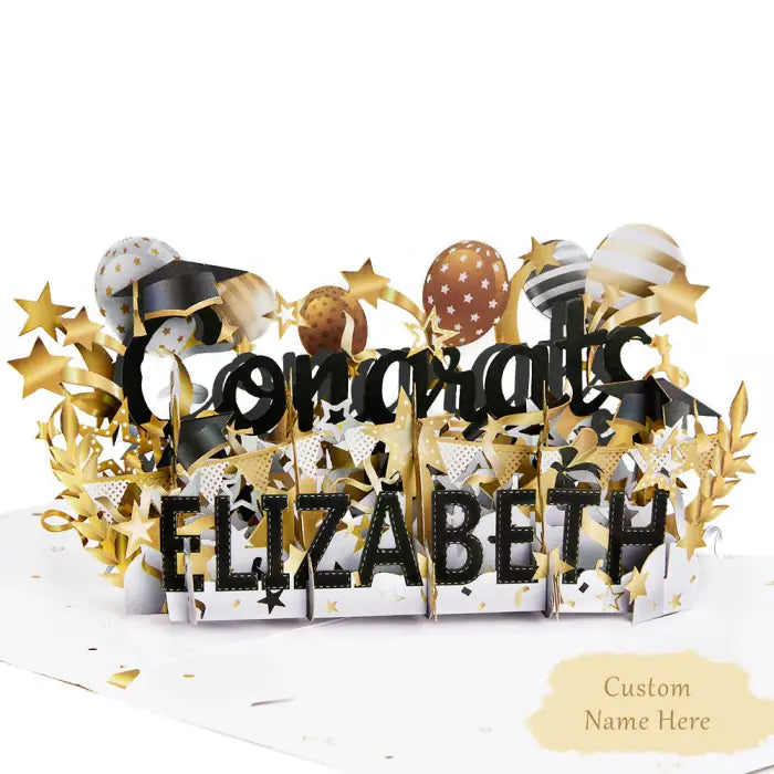 When the graduate opens the card, he/she can see the golden confetti, stars, balloons and graduation caps surrounding the bright black letters, reading "Congrats & NAME". You can personalize the graduate's name which surely brings unforgettable memories to him/her for congratulations on graduation. It's suitable for those who just graduated from high school, college or university... with a bright future wishing.