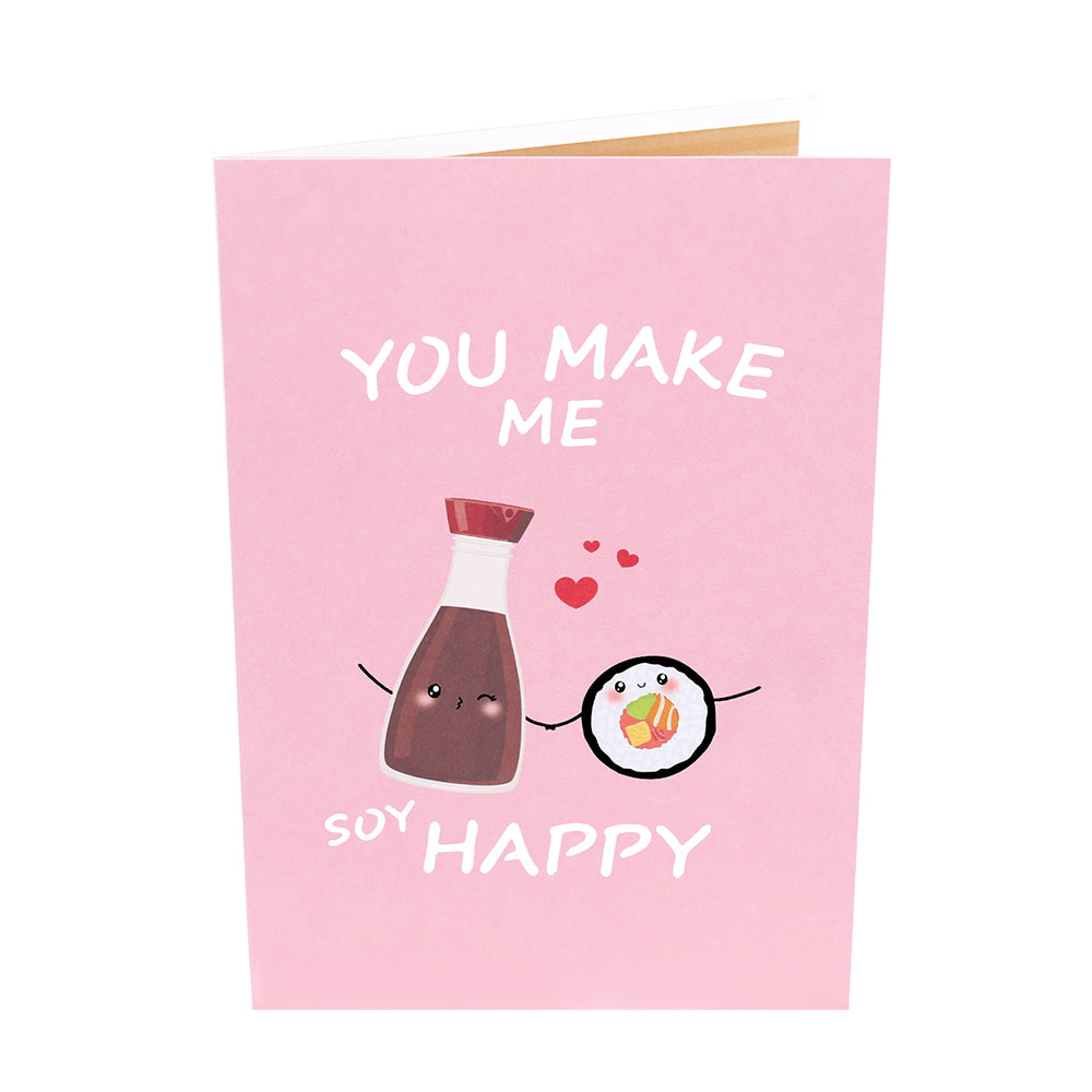 The Sushi and Soy Love card pops up a bottle of soy sauce and hand holding sushi roll on traditional sushi restaurant background, creating a yummy and cute picture. With a funny design and sincere sentiment, this kawaii card will be a sweet surprise for your lovers, kids, sushi lovers, or any special ones you wish.